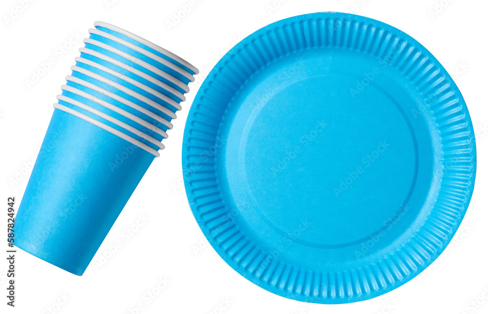 Blue empty paper disposable plate and cups on white isolated background, top view