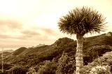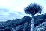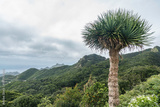 Dragon tree is growing on mountain in Anaga national park, Tenerife, Spain on overcast March day
