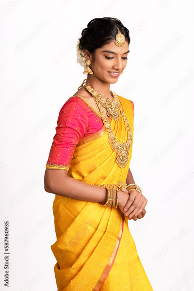 Beautiful Indian young Hindu Bride against white background in studio shot
