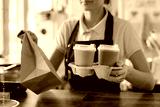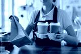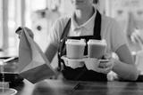 Buying fast food. A pancake with filling and a paper cup with coffee in the hands of a woman seller and a customer in the cafeteria. Takeaway food.