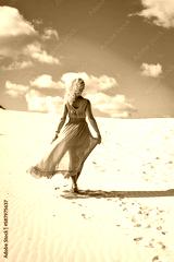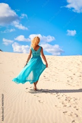 Beautiful blonde woman on hot sand with blue sky in the background. Photo taken on the shifting dunes over the Baltic Sea in Łeba, Poland. Photo with a shallow depth of field with blurred background.