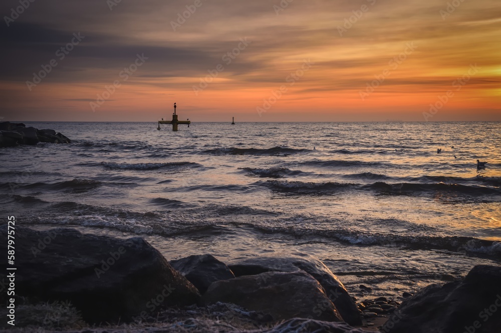 Beautiful morning seaside landscape. Cloudy sunrise over the Baltic Sea. Photo taken on the beach in Gdynia, Poland.