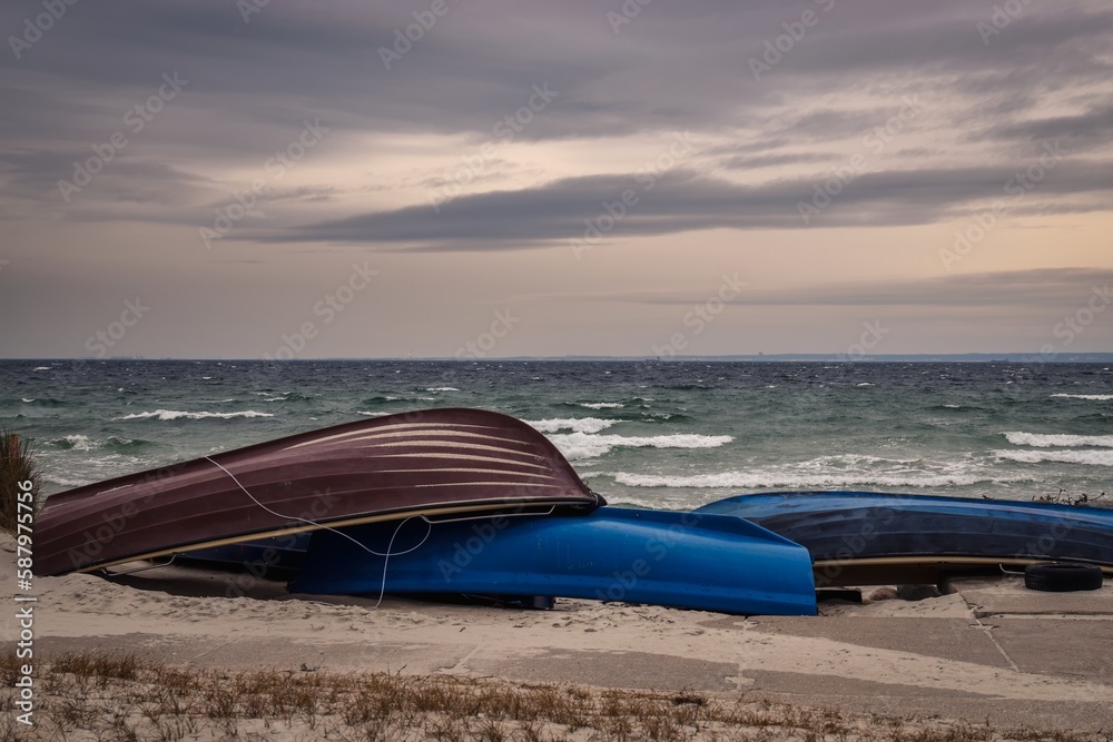 Winter cloudy seaside landscape. Boats on the shores of the Baltic Sea. Photo taken in Gdynia, Poland.