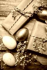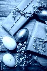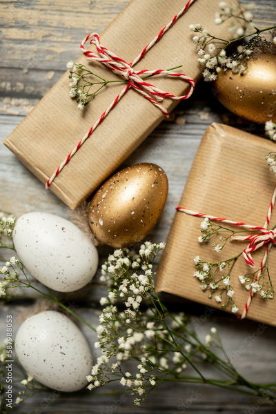 Easter eggs, flowers and craft gifts in eco style on a rustic wooden background. easter layout with place for text. copy space. flat lay.
