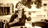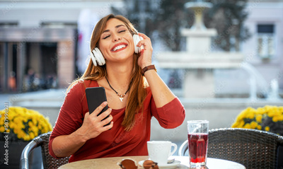 Happy young woman sitting in the cafe and listening favourite song via smartphone and headset. Lifestyle, technology concept