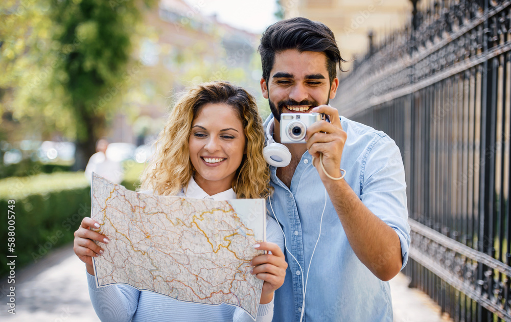 Young tourists enjoying on vacation, having fun in the city. Concept of tourism