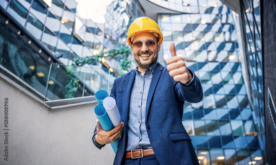 Construction supervision. Satisfied architect making inspection on building site. Construction concept