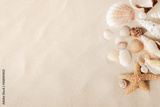 Sandy beach with collections of white and beige seashells and starfish as natural textured background for summer travel design