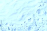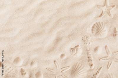 Top view of a sandy beach texture with imprints of exotic seashells and starfish as natural textured background