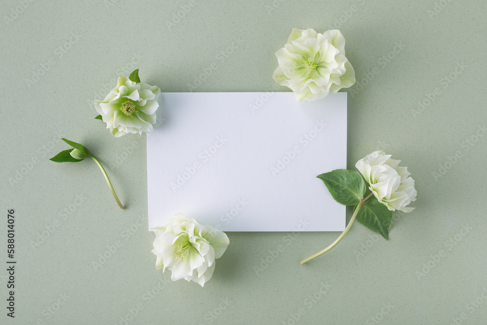 Invitation card mockup with empty paper blank decorated natural flowers top view. Minimal aesthetic template.