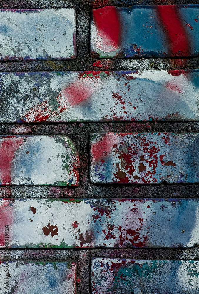 Graffiti brick wall, colorful background, Retro Vintage Worn Wall Wallpaper, Decayed Cracked Rough Abstract Banner Surface.