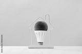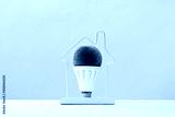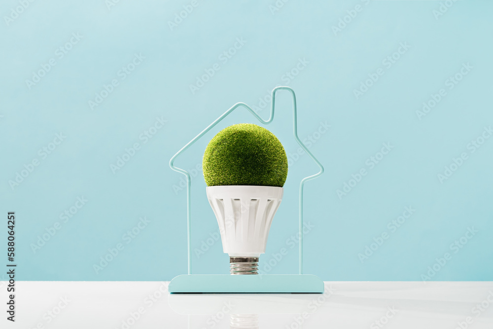 LED green grass light bulb inside house frame on blue background. Green energy saving and smart house solutions. Sustainable consumption. Earth Day. Smart ideas