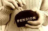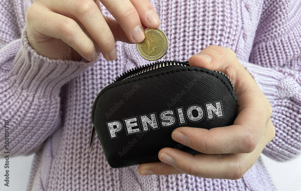Woman's hand putting coin in black wallet with word Pension