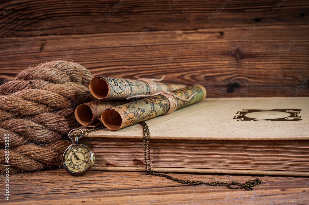Old items, map scrolls and a pocket watch lying on an old book next to a thick rope