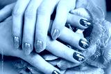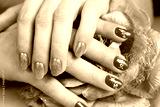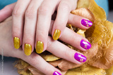 Female hands with a gold and purple colour nails. Nail design. Artistic manicure with gel polish