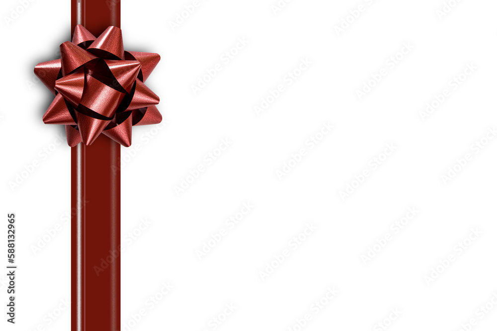 Burgundy ribbon with gift bow on isolated white background. Top view, flat lay