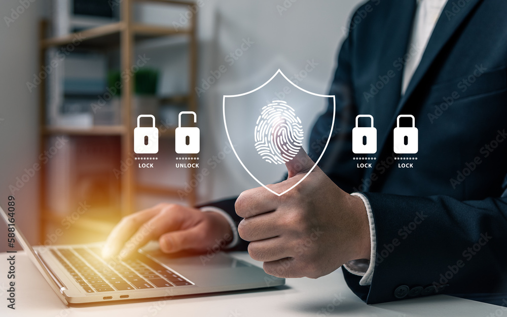 Cyber security and biometric authentication concept, businessman touching virtual screen fingerprint recognition to unlock, padlock, global network security, identification, verification.
