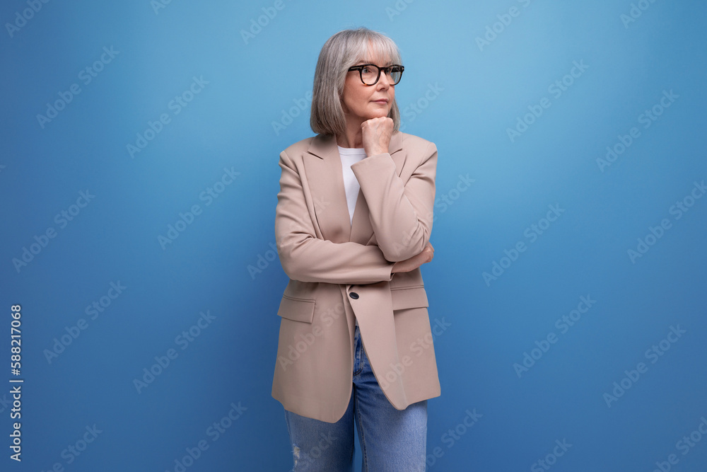 60s mature woman in business attire stands thoughtfully on a studio background with copy space