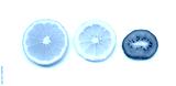 Fruit slices set, closeup on white background. Bright pieces of fresh lemon, orange, and kiwi. Chineese gooseberry and citruses, colorful exotic fruit cut into circles. Tasty food, healthy diet.