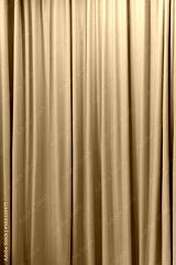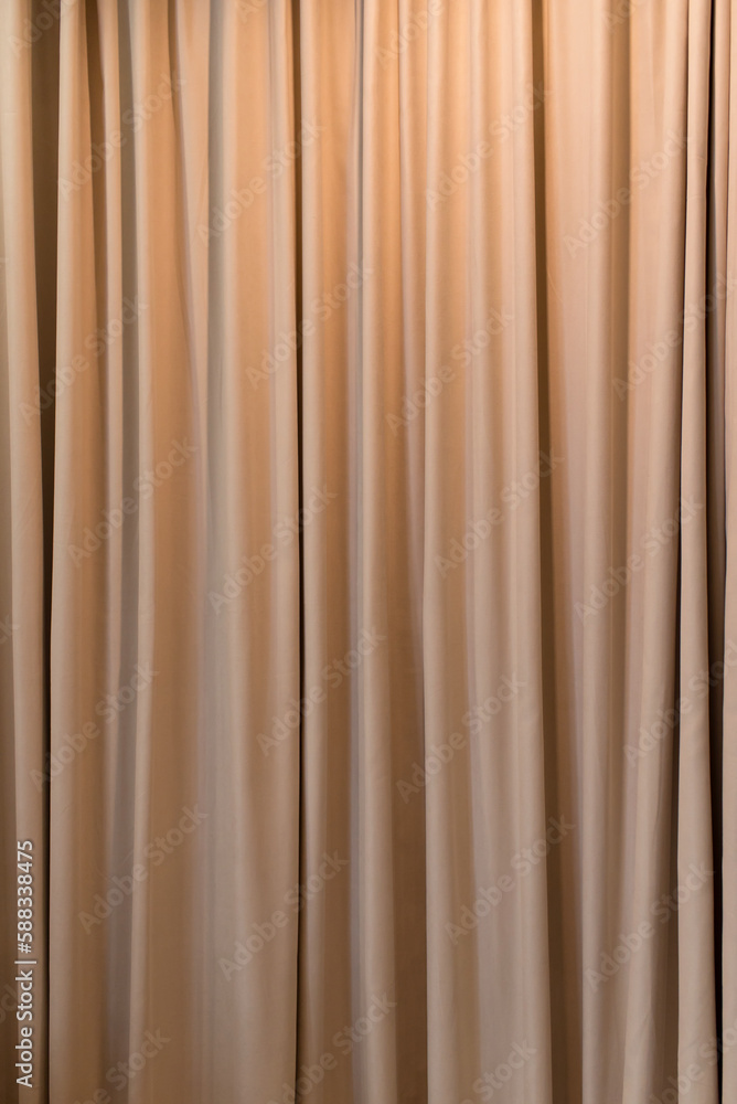 Beige curtain fabric texture and background. Large wall curtain. Curtain for hotel presentations. Cream colored cloth. Vertical photo.