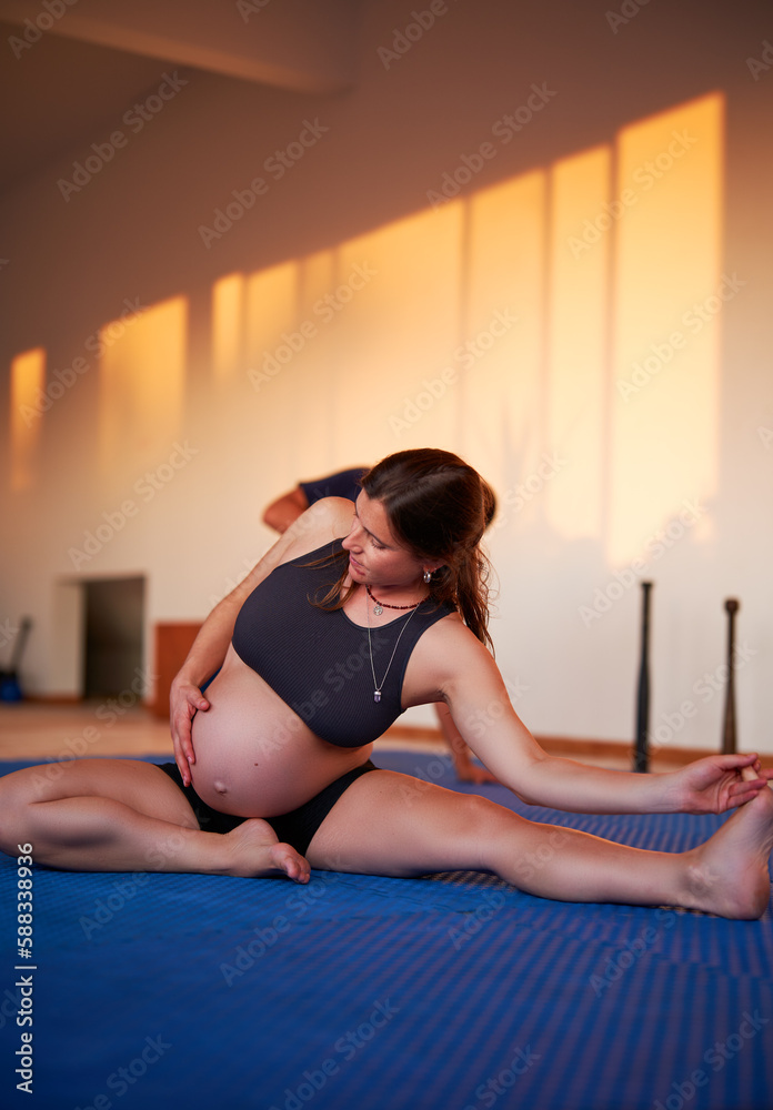 portrait pregnant caucasian woman doing yoga stretching indoors in yoga studio