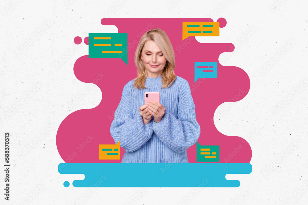 Collage portrait of positive grandmother use smart phone typing message chatting isolated on drawing background