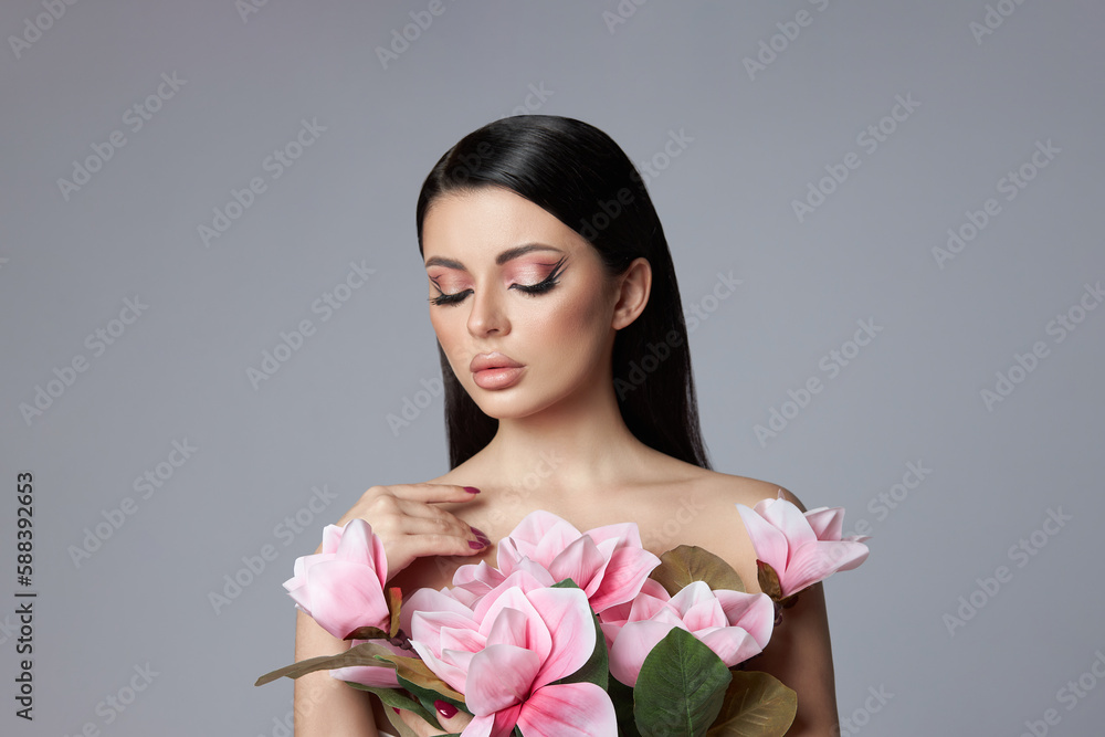 Beauty portrait of a woman, pink eye shadow makeup, arrows and long eyelashes. Brunette woman, red nail polish, natural cosmetics