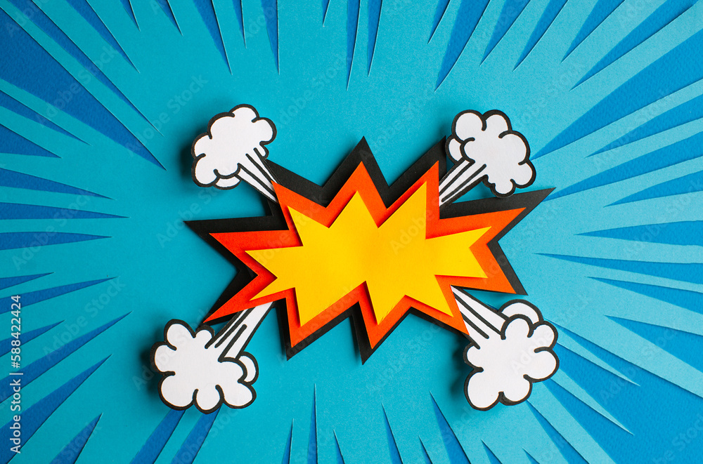Empty speech bubble for your design. Handmade cut out paper craft art work on blue background. Pop art and comic style.