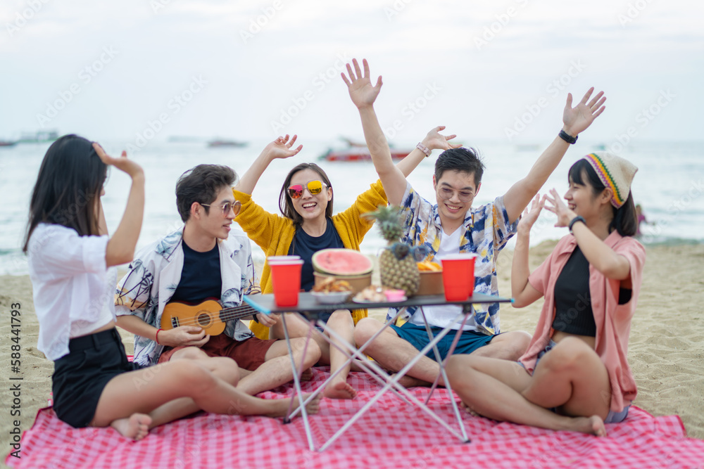 Attractive friends traveler sing and dance while camping at seaside enjoy holiday vacation trip in tropical sea island together.Group of Asian young woman and man having party on the beach at night.