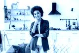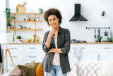 Photo of a beautiful positive stylishly dressed curly haired african american girl, standing in the living room at home against the background of the kitchen, looking at the camera, smiling happily