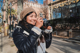 Young photographer woman smiling and shooting a picture on a weekend trip. Happy asian girl having fun taking a photo shot to old building with a vintage professional camera on a travel in Europe