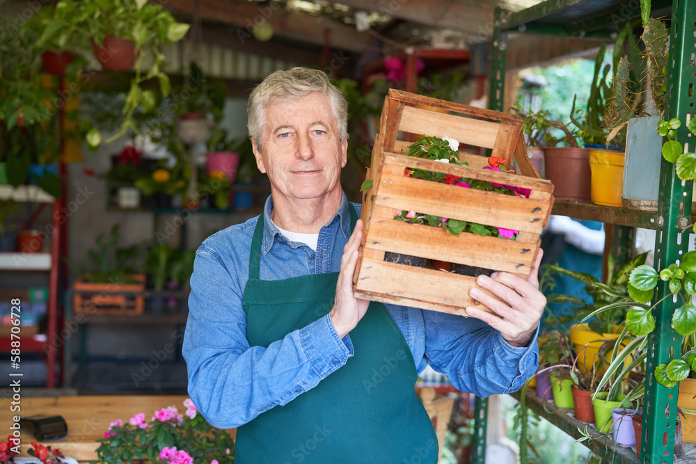Senior Chef in seiner Gärtnerei mit einer Kiste Blumen