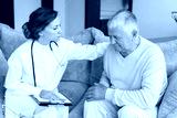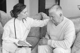 Nurse came to visit an elderly patient at home. Doctor tells an senior man about a bad diagnosis