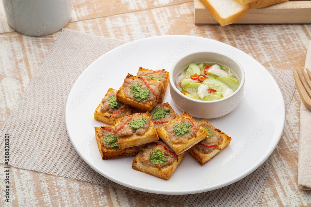 Fried Bread with Minced Pork Spread in white plate ,fry in the Air fryer,traditional snacks and appetizers in Thailand