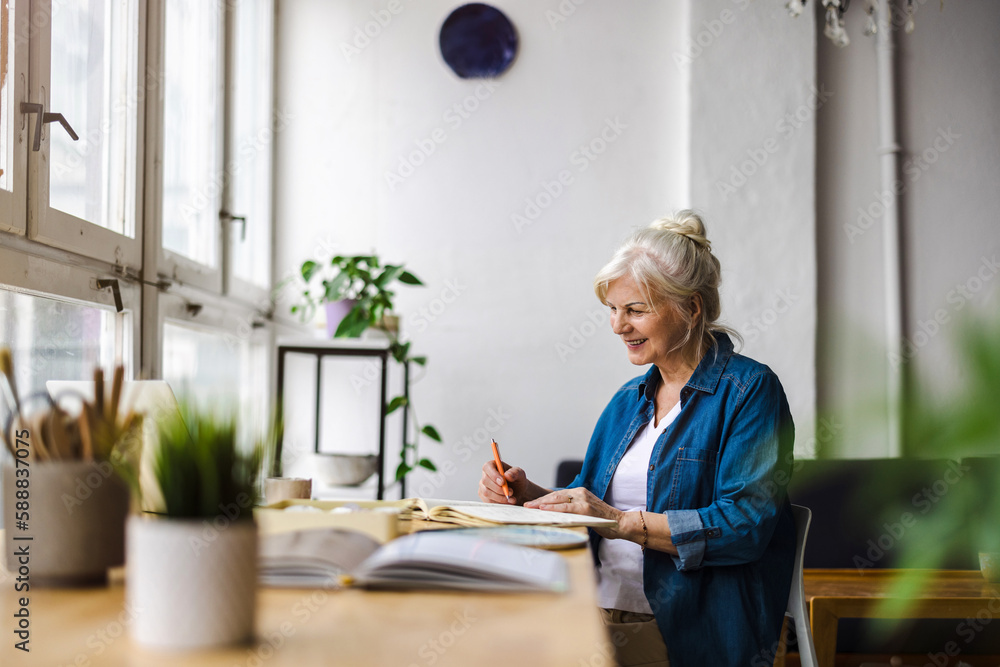 Smiling mature businesswoman writing in notebook while sitting at table in office