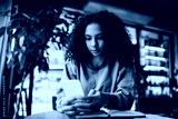 Focused black woman using smartphone in cafe