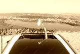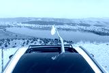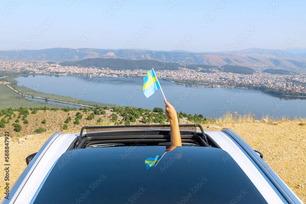 Woman holding Sweden flag from the open car sunroof, window driving along the serpentine road in the mountains. Top view. Concept