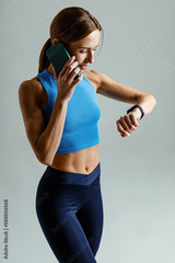 Woman talking by phone and looking on wristewatch standing on studio background. High quality photo