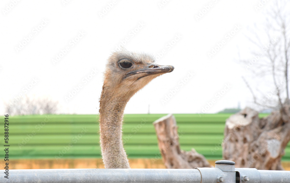 Head of an ostrich with an eye staring at the camera after the bird just took a dust bath. Native animal of Africa,The common ostrich, Struthio camelus in Athens, Greece, Attica Zoo environment.