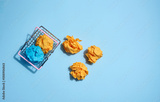 Crumpled balls of paper in a miniature shopping cart on a blue background. New ideas and innovations