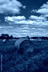 Beautiful summer rural landscape. Hay in a field with a blue sky in the background.