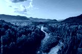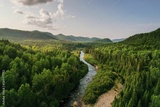 Narrow river between trees and greenery with mountain in the background under cloudy sky