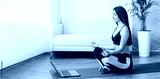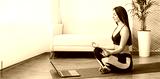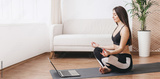 Beautiful woman doing yoga at home and watching tutorial lesson on laptop in sunny day.