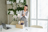 Dismissal. Fired frustrated employee woman packing belongings in cardboard box leaving workplace.