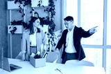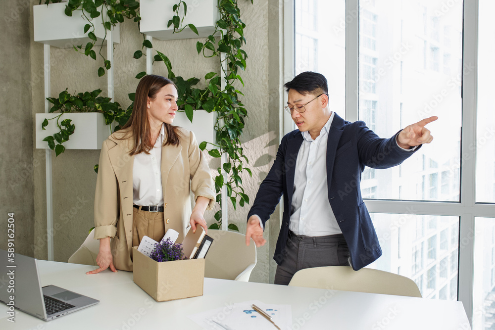 Employee layoff dismissal. Angry asian boss firing upset female employee in modern office.