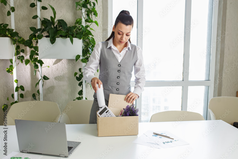Dismissal. Fired frustrated employee woman packing belongings in cardboard box leaving workplace.