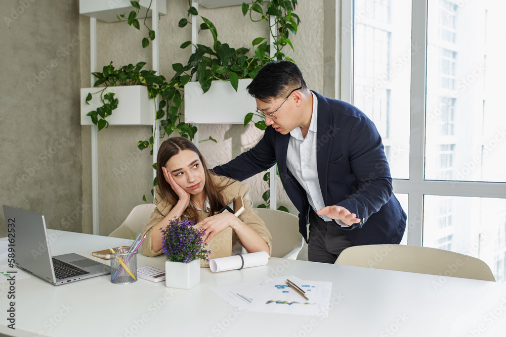 Asian man coworker support upset female employee dismissed from work, depressed disappointed woman.