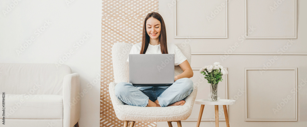 student girl using laptop at home. woman sitting on chair smiling and looking to screen