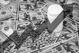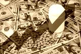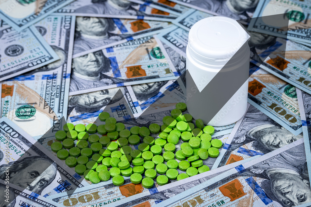 Medicine pills or capsules with dollars and arrow up. The concept of growth in the production of medicine pills or prices for them. Growth in sales, demand and purchases.