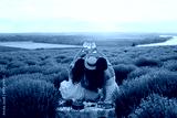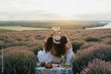 Back view of three female friends in nature clinking with a glasses of wine. Picnic in lavender field at sunset.